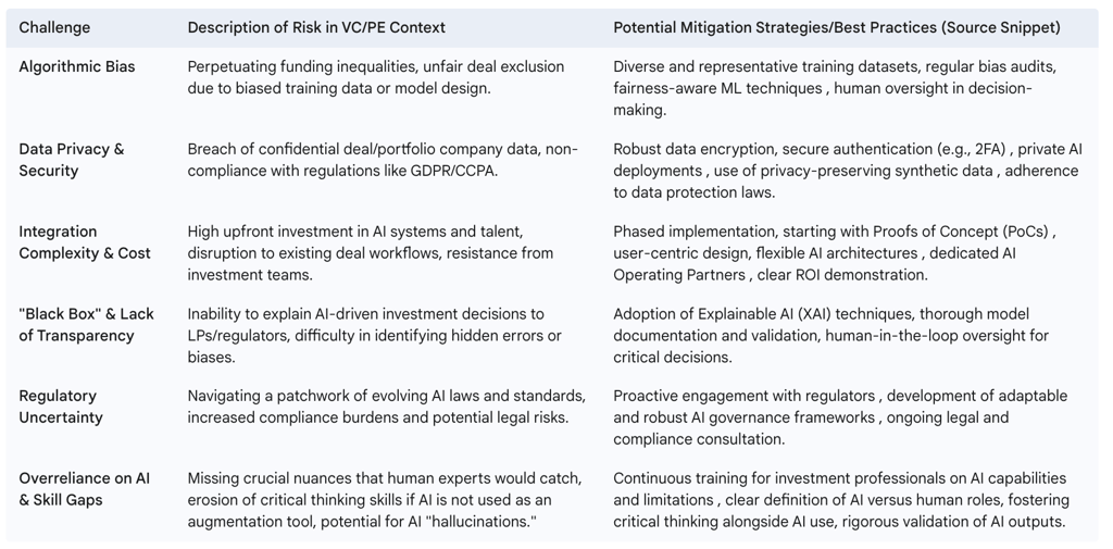 The analysis reveals that while both VC and PE firms are aggressively leveraging AI, their approaches and primary objectives differ, reflecting their distinct investment mandates. VC firms are notably active in investing in AI-native companies and utilizing AI to identify high-growth potential and emerging market trends. In contrast, PE firms are predominantly focused on deploying AI as a powerful lever for operational efficiency and value enhancement within their portfolio companies. The benefits are tangible, manifesting as significantly improved efficiency, augmented decision-making capabilities, and new avenues for competitive differentiation. However, this technological revolution is not without its complexities. Critical challenges include ensuring data quality and security, navigating the ethical implications of algorithmic bias, managing the high costs and complexities of implementation, and addressing the evolving regulatory environment. Furthermore, the integration of AI is profoundly altering the human element in investment, necessitating new skillsets and restructuring roles within firms.