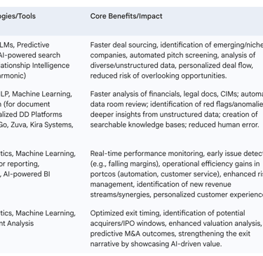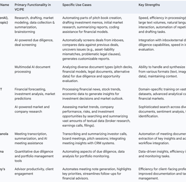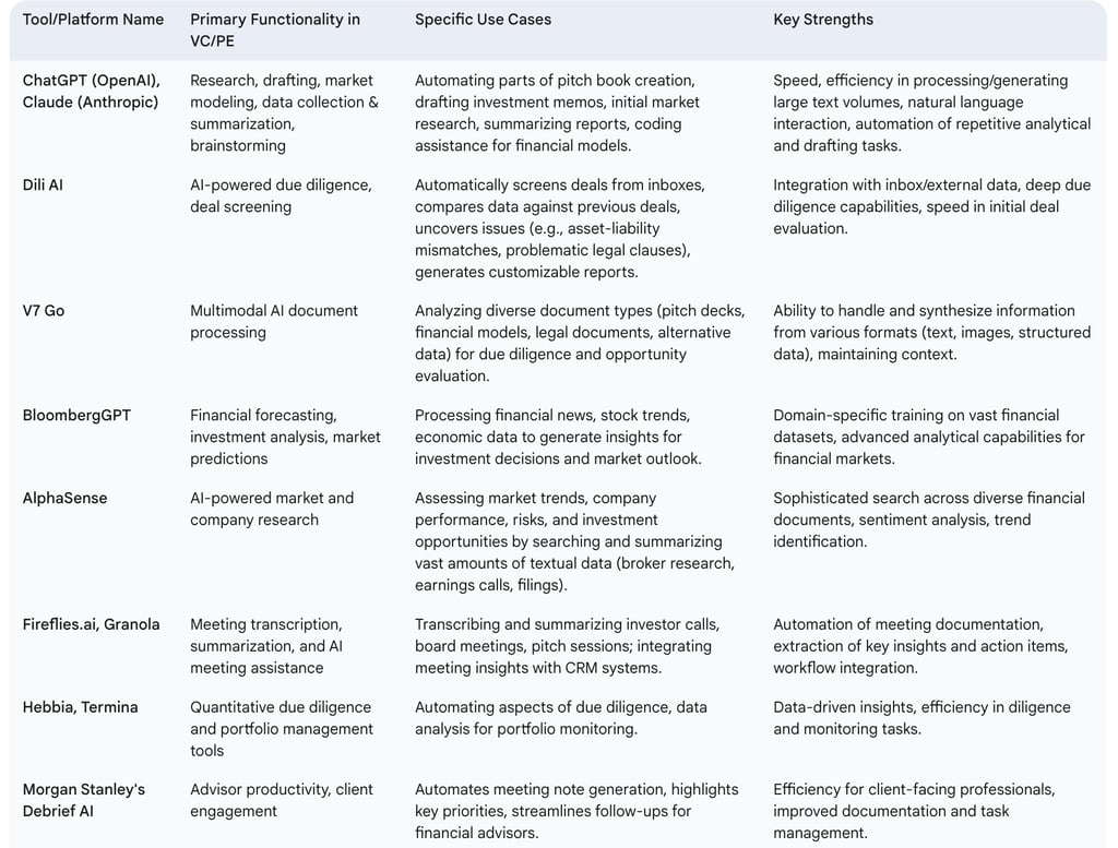 The AI revolution in VC and PE is not driven by a single technology but by a diverse and expanding toolkit. While generative AI, exemplified by models like ChatGPT, has garnered significant attention for its ability to create content and interact in natural language , it is part of a broader suite of AI capabilities transforming investment processes. This suite includes Large Language Models (LLMs), which power many generative AI applications and are adept at processing and understanding vast amounts of text ; Natural Language Processing (NLP), enabling machines to interpret and derive meaning from human language in documents, reports, and communications ; machine learning (ML) algorithms that identify patterns and make predictions from data ; and predictive analytics, which leverage historical and real-time data to forecast future trends and outcomes.